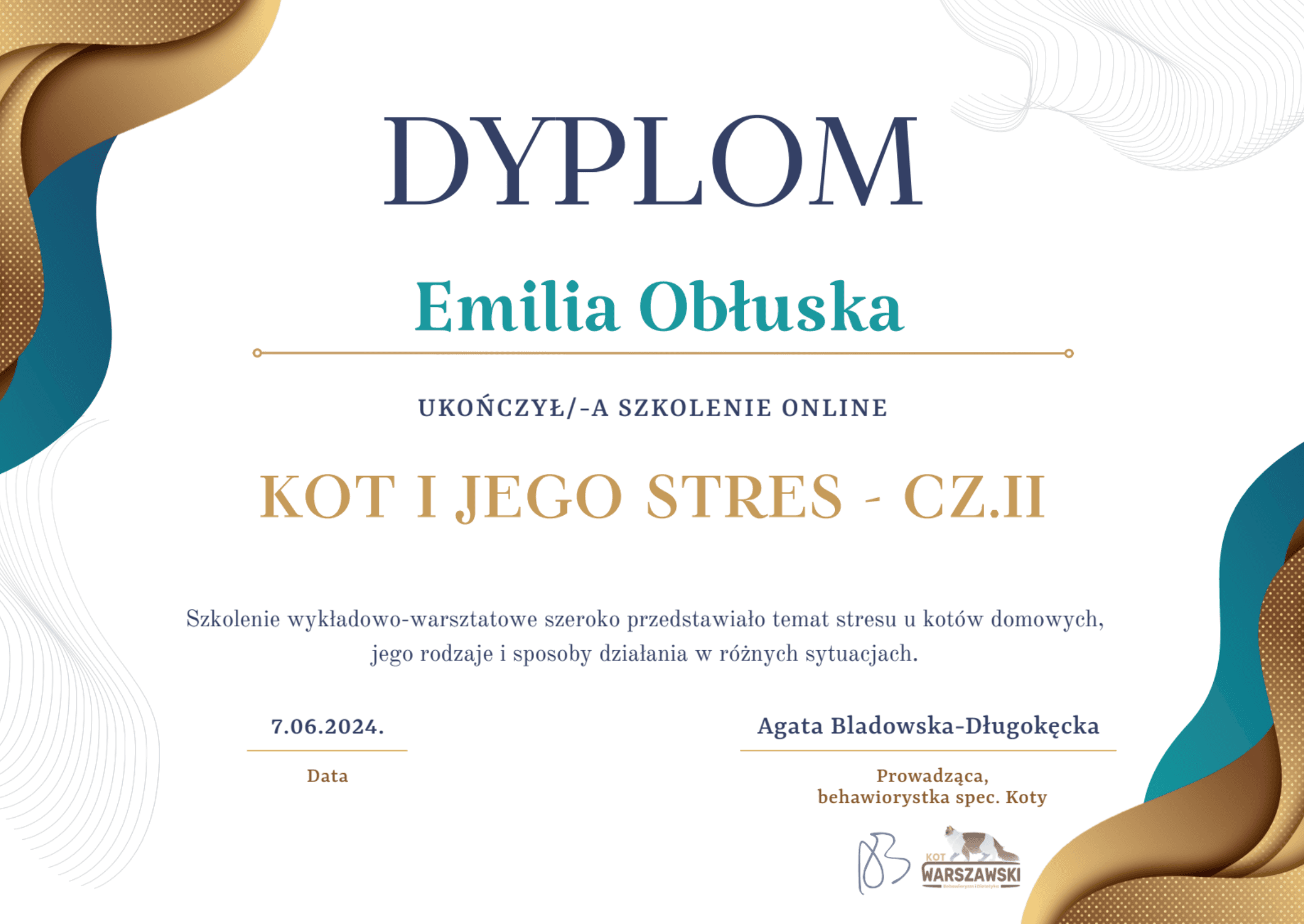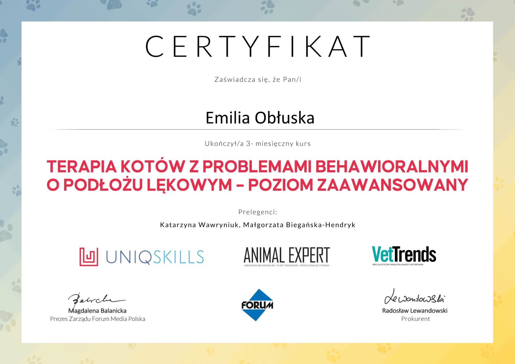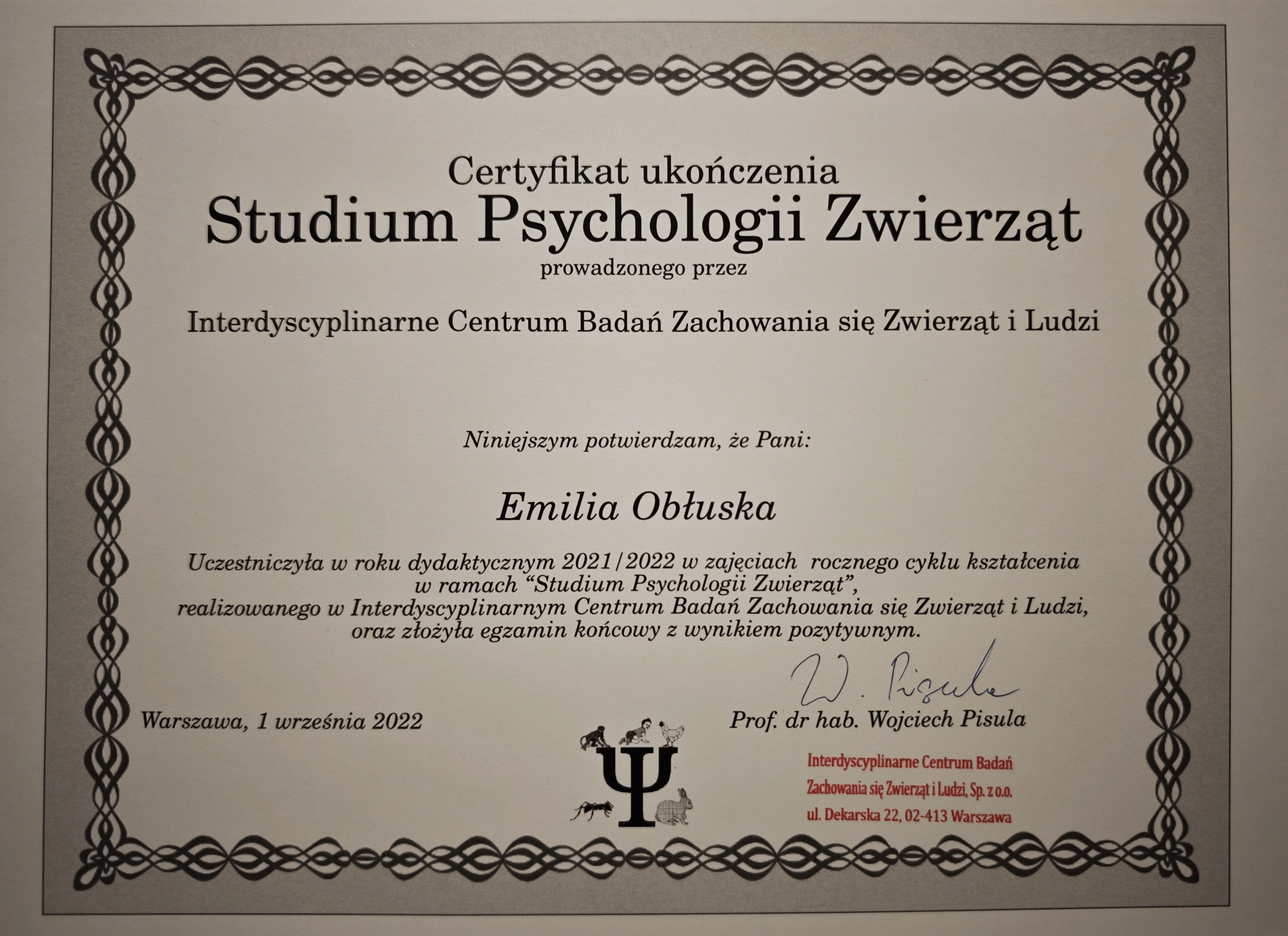 Jestem behawiorystką po studiach kierunkowych, rocznym kursie psychologii zwierząt, studiach podyplomowych z behawiorystyki kotów i wielu, wielu godzinach certyfikowanych kursów doszkalających.