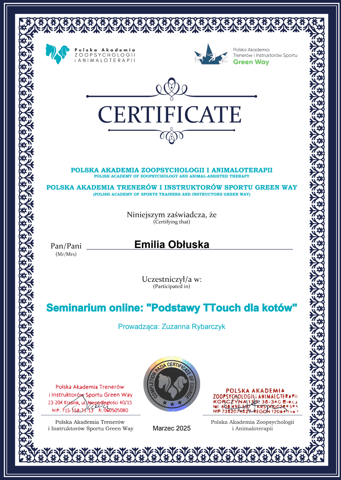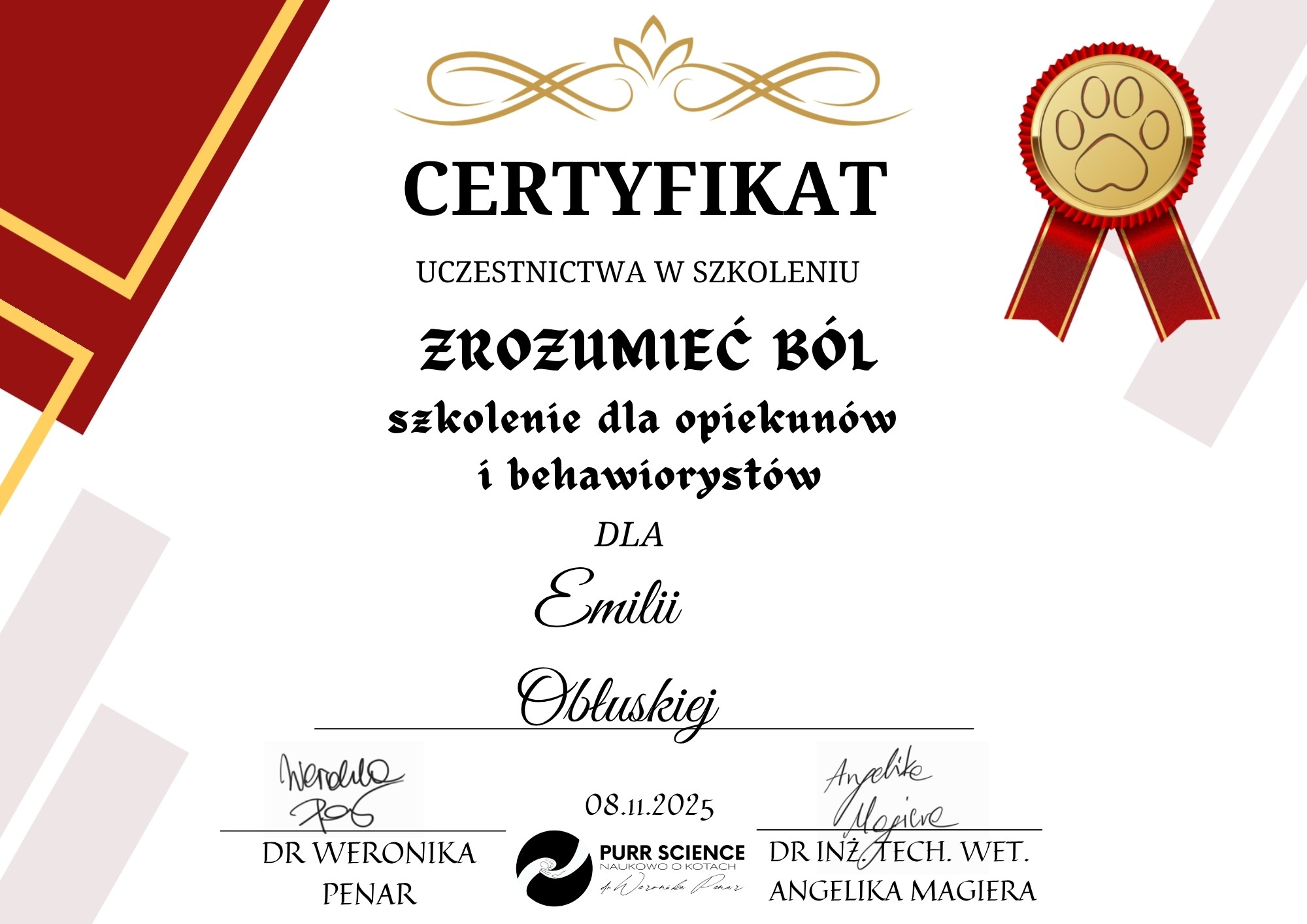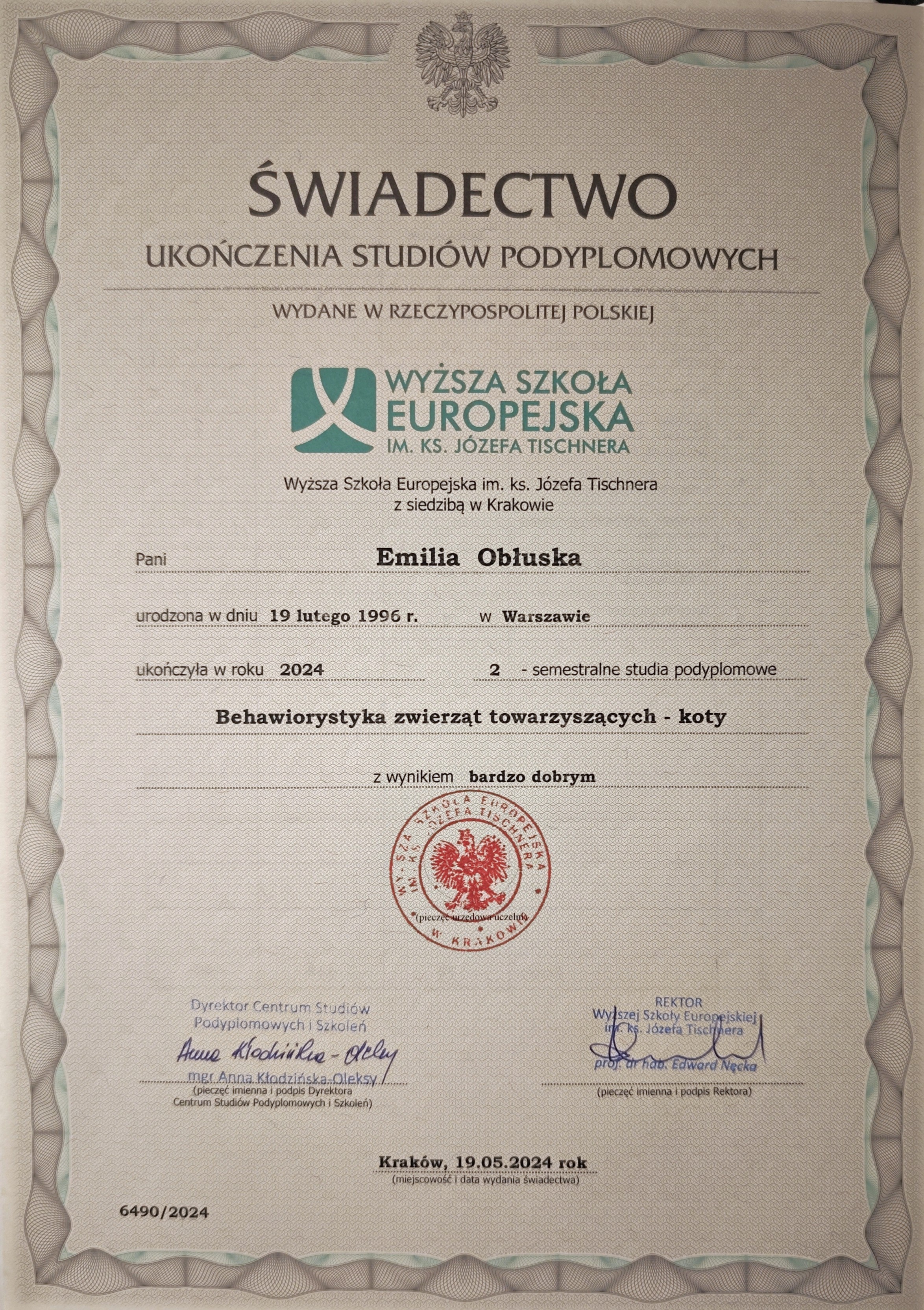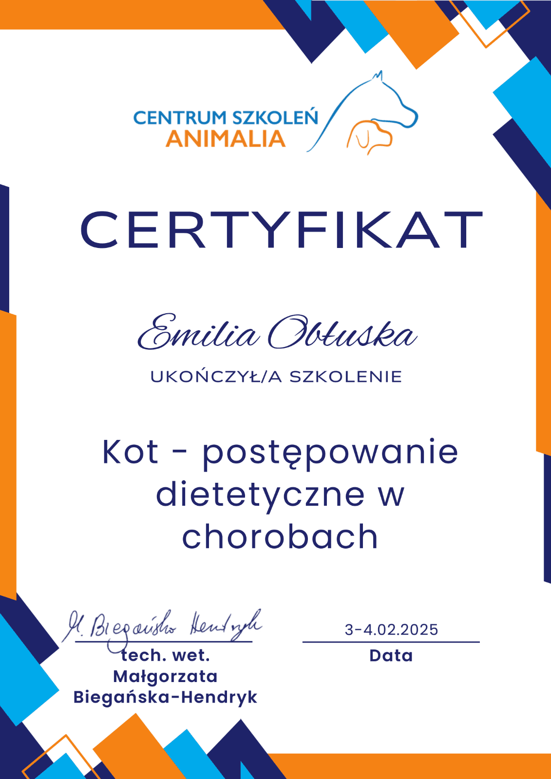 Jestem behawiorystką po studiach kierunkowych, rocznym kursie psychologii zwierząt, studiach podyplomowych z behawiorystyki kotów i wielu, wielu godzinach certyfikowanych kursów doszkalających.